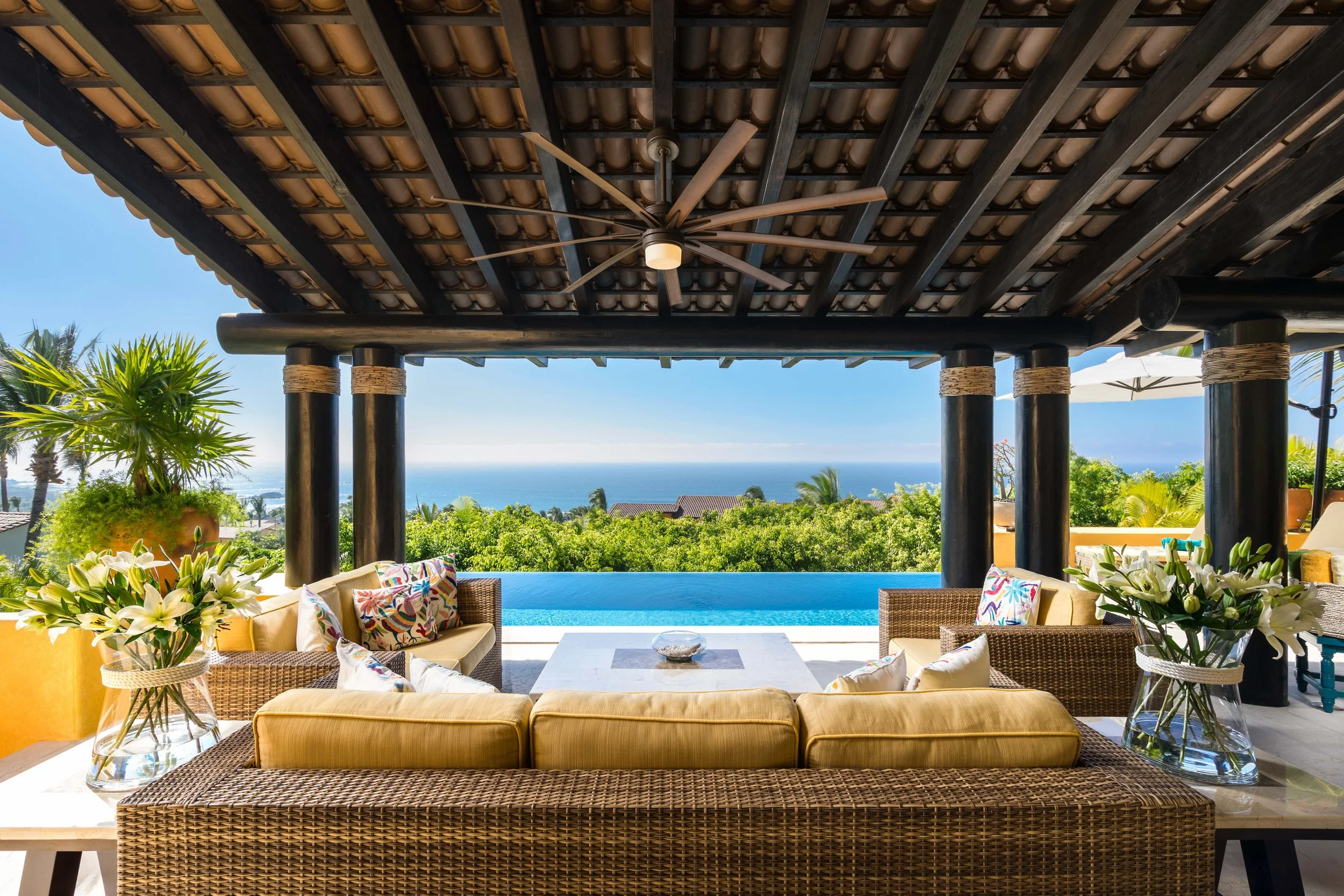 The sense of entry is especially intriguing, as you pass through a beautiful interior courtyard into an open concept main living area with vaulted ceilings and amazing ocean vistas. From the main living and dining area, step out onto a private terrace complete with private pool and jacuzzi off the master suite. All bedrooms come complete with full ensuite bathrooms and private seating areas, enhancing livability and group or multigenerational travel. The kitchen is very nicely appointed with Wolf and SubZero appliances, separate pantry and direct access to a full service area
